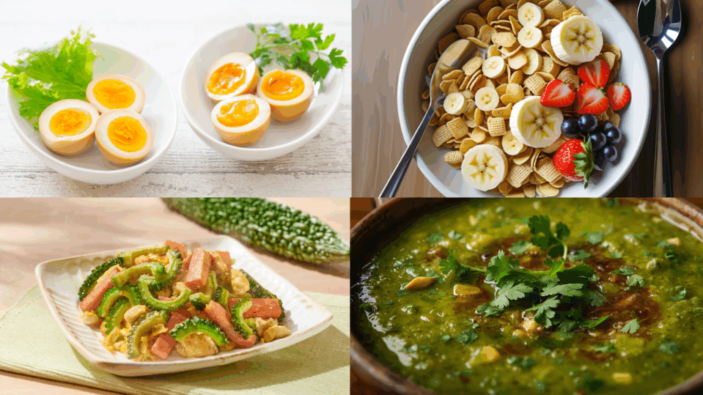 ゴーヤ・ゆで卵・シリアル・モロヘイヤ