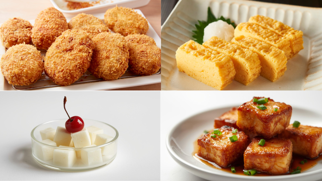 杏仁豆腐、コロッケ、餡かけ、玉子焼き。