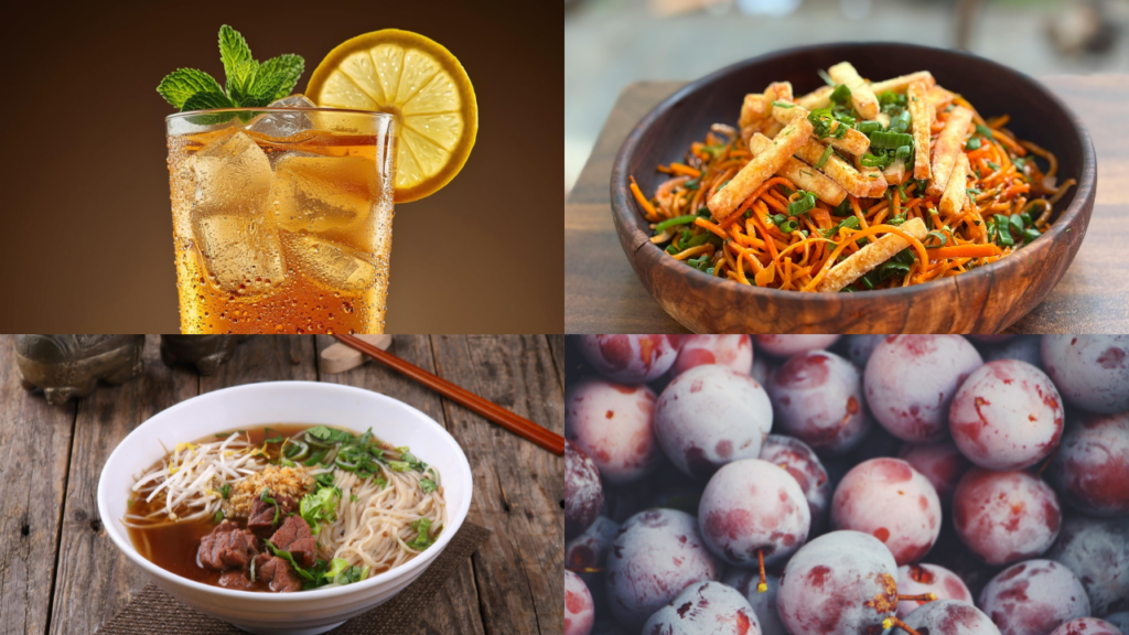 ジンジャーエール、フォー、焼きビーフン、プルーン。