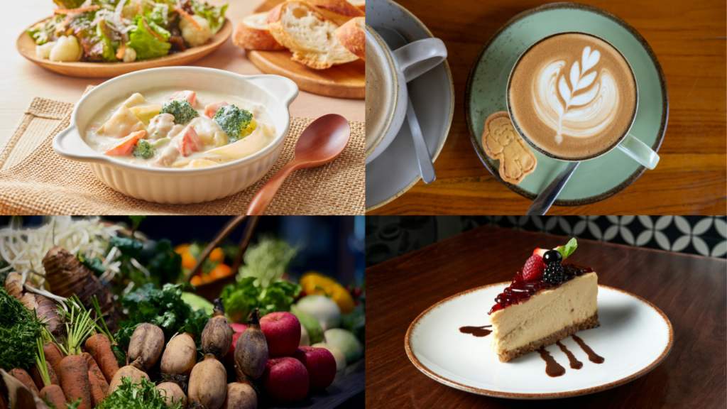 ラッキーフードは、カフェラテ、シチュー、オーガニック野菜、チーズケーキ。